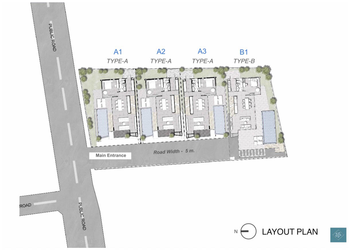 This layout plan illustrates the overall project of Mali Thai Villa, consisting of just four exclusive pool villas. Three units (A1, A2, A3) are Type-A, while one unit (B1) is Type-B. Each villa has been carefully positioned along a 5-meter wide internal road, with the main entrance directly connected to a public road. The layout is designed to maximize privacy, convenience, and mountain view orientation, creating a serene community atmosphere with easy access and elegant separation between units.