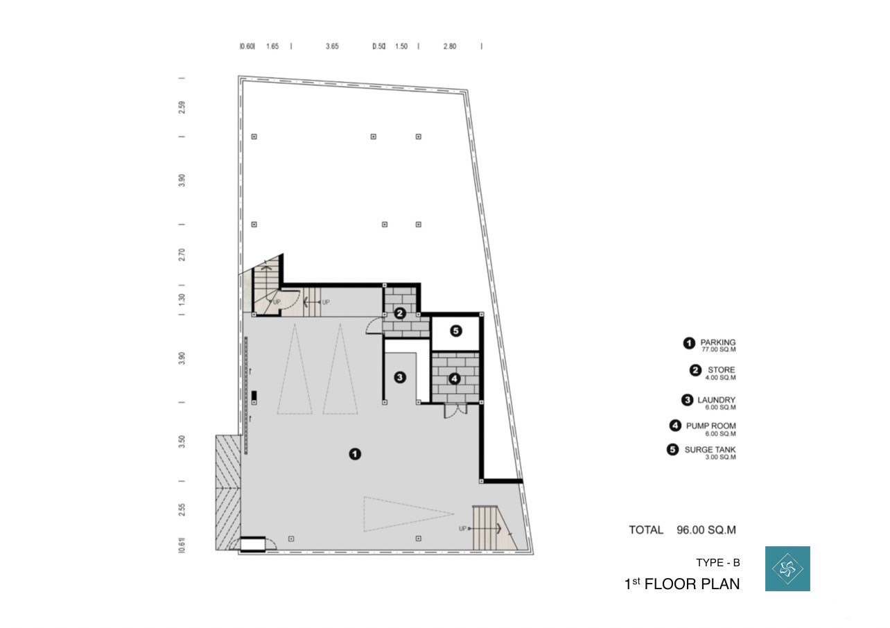 This first floor plan of Type-B villa covers 96 sq.m, primarily designed as a parking area that fits 2–3 cars, ensuring privacy and convenience. It also includes a dedicated storage room, laundry area, pump room, and surge tank space. Inspired by practical luxury, this floor reflects the developer’s commitment to seamless living — from everyday needs to hidden infrastructure that supports comfortable, effortless villa life.