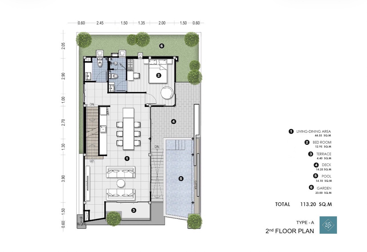 Spanning 113.2 sq.m, the second floor of Type-A villa offers a seamless blend of indoor comfort and outdoor relaxation. The centerpiece is a spacious open-plan living and dining area of 44.55 sq.m, perfect for gatherings or quiet evenings. A cozy bedroom with direct access to a private terrace enhances the sense of privacy and charm. This level extends to a serene deck and a stylish private pool, ideal for leisure and entertaining. Surrounded by a 23 sq.m garden, this floor delivers a refreshing connection to nature — balancing functionality and tropical elegance.