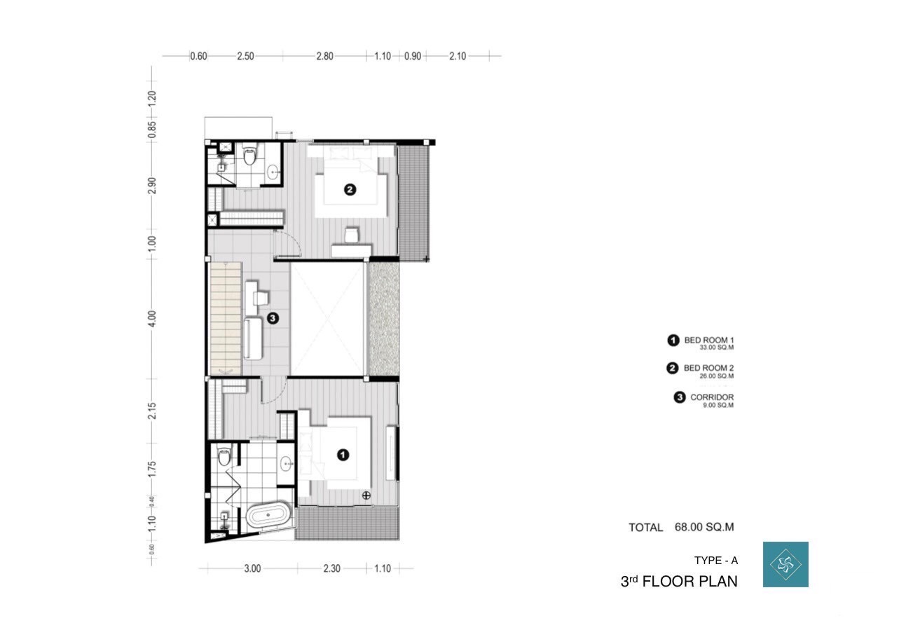The third floor of Type-A villa spans 68 sq.m and serves as the private sleeping quarters of the home. It features two spacious bedrooms — the master bedroom (33 sq.m) and a secondary bedroom (26 sq.m), each designed for comfort and tranquility. A central corridor of 9 sq.m connects the two rooms, offering flexibility and flow within the space. This level is crafted to ensure peaceful rest, with subtle luxury in layout and lighting, making it a personal retreat within the villa.